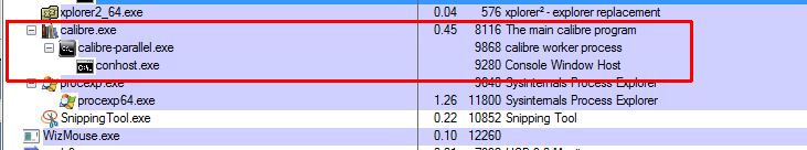 .Calibre always seems to start a *worker process* as child and it in turn starts a *console window host*, as in So what could possibly stop calibre from starting another worker branch to do a conversion, open a file for viewing etc. Something to do with Windows Process Security maybe. @steve2112 - did running in safe mode provide any insight? If it works then that would point to one of your start up tasks interfering. In Sysinternals Process Explorer you can look at the Process Properties (right click menu) where there's a Security tab that shows Process Permissions, you might want to take a look in there for 'something' askew - sorry I've no idea what. Task Manager's Properties/Security tab shows the File Permissions - this suggests MS doesn't know the difference between a file and a process, or a permission and a persimmon BR |