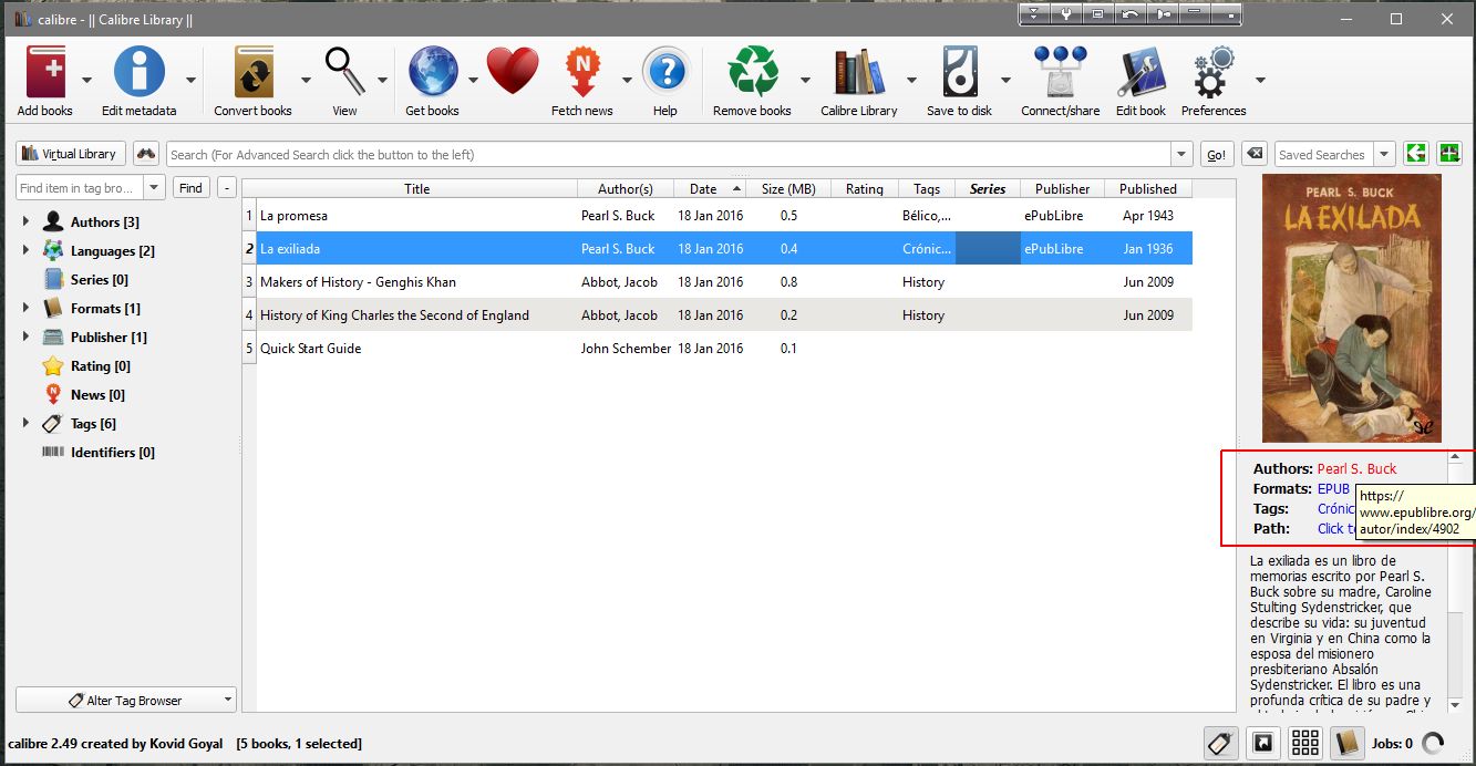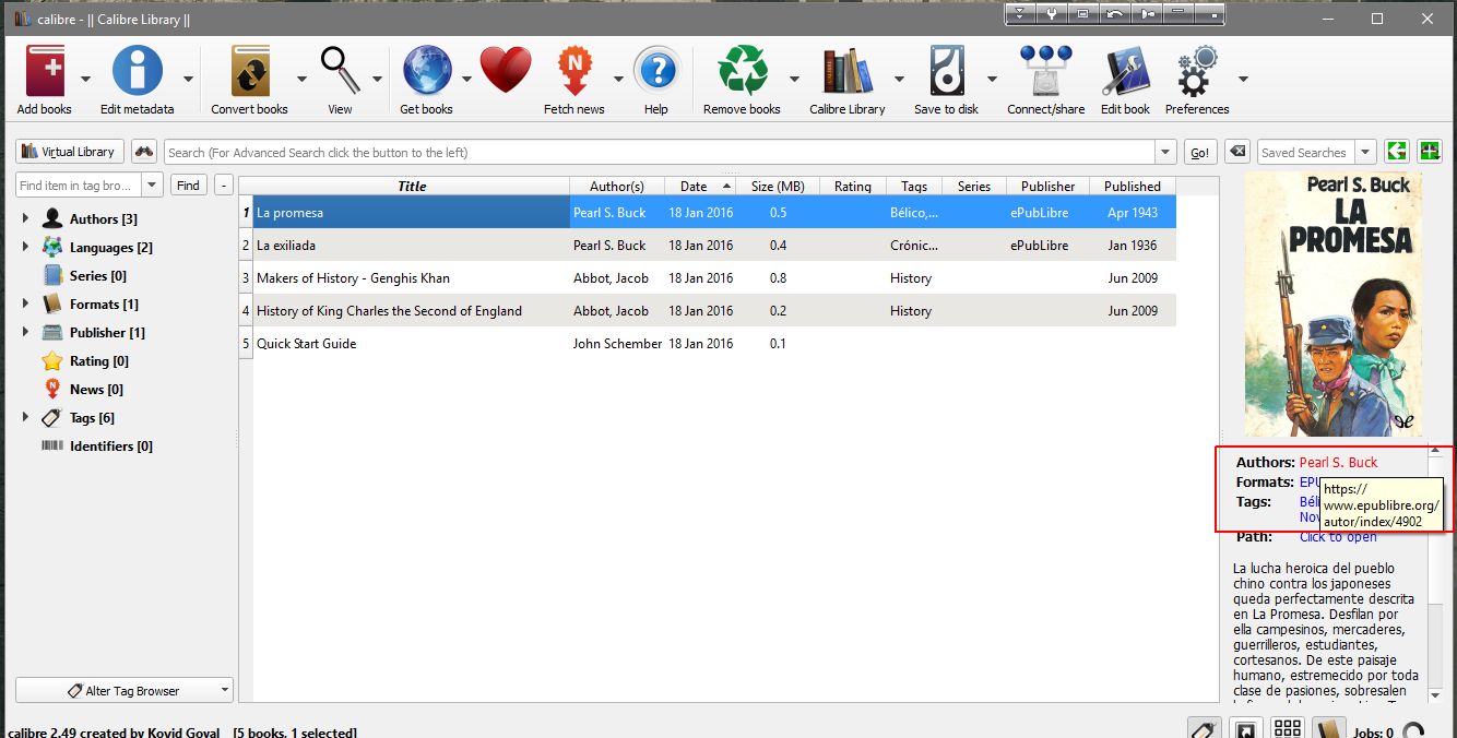 I downloaded La Exilada and La Promesa by Pearl Buck from epublibre.org, added La Exilada then entered her epublibre.org page into the Link field, it worked of course. I then added La Promesa and the link to epublibre.org still works See attached screen shots You can see in the screen shots that it picked up the Publisher, Published Date and Tags from the inside the file, as well as the Author and Title. Which operating system do you use - Apple OSX, Linux or Microsoft Windows? If Windows which 'edition' of calibre, 32 bit, 64 bit or Portable - I have tested 64 bit and Portable. Aside : after the add, the Title Sort had 'La promesa' on pink, to 'fix' it I had to hit the button between Title and Title Sort which changed it to "promesa, La". The Author Sort field had "Buck, Pearl S." on green. I do not know if the book's language (Spanish) has any role to play in this, or the fact that it is different to the calibre interface language or my language setting in Windows. But I wouldn't think any of that has anything to do with the Author Link field - but maybe I'm wrong. All Preferences with the exception of the L&F->Book Details->default author link template are the default settings. BR Last edited by BetterRed; 01-17-2016 at 11:14 PM. |
