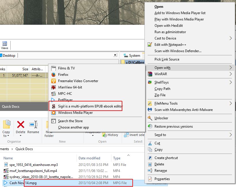 Not just MP3 also FLV, AVI , MPG, PDF etc, etc. I appreciate they can be embedded within ePUB3.0, but surely I'm never going to do that by opening them in the Windows shell, would have thought I'd do that from within Sigil after opening the relevant EPUB container. Could there be an an option in the Windows install to NOT create these 'candidate associations' and remove them if they're already there. Sigil (and plenty of others - browsers etc) 'get in the way' of programs that can do something useful with these files. Firefox puts itself forward as a candidate to handle CBZ's - when I dropped 'file:///users/BetterRed/Downloads/picturebook.cbz' into it -- if offered to download it - into my Downloads folder With Windows 10 (maybe 8/8.1 too), MS made some radical changes with the way Open With works - Kovid calls in an 'unholy mess' I call it 'Calamities on Toast'. Sadly Nir Sofer is yet to produce an OpenWithView that works with Win10 so there is no simple way of removing these candidate applications, you have to wrangle the registry by hand. Yes, I do use Open With a lot, as I've always done. Beats me why MS would make something that most of its user base don't use, even harder to use for those of us who do use it. At a guess I'd say 80% of Windows users never right click in the shell, much less use Open With. They click on desktop program icons, and use File Open. BR Last edited by BetterRed; 04-20-2016 at 11:05 PM. |