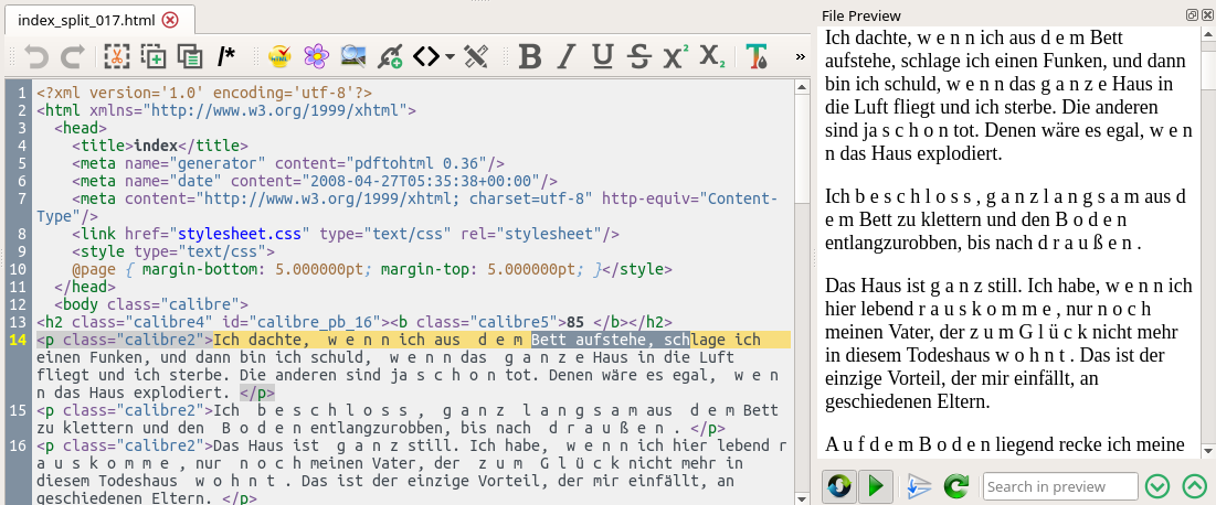 Run Fix HTML - all files & Beautify all files Find: \s\s Replace: *SPACE* Replaced 3494 occurrences Differences between books (excerpt) Result: Optical confusion Run again Fix HTML - all files & Beautify all files Seems OK Checkbook was before, during and after the procedure OK. Or do you see/know something that I overlooked? Line end problems!?
