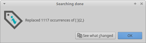 ![]() With F&R (Find and Replace) (in MR also called S&R (Search and Replace)) I want to reduce double spaces to one, with command Replace all. I repeated the procedure several times, waited, no changes! Find: *SPACE**SPACE* Replace: *SPACE* 1212 occurrences Click: See what changed Calculating differences, please wait This window does not appear!? No changes found In fact, there was also nothing changed. My e-reader displays the locally occurring spaces in the words, but not the double spaces between. A similar (cosmetic) procedure I have already done some time before, successfully carried out in another book, there were more than 150000 occurrences. Interna: Roche (F) Last edited by chaot; 05-17-2016 at 06:59 AM. Reason: add image Calculating differences, please wait |