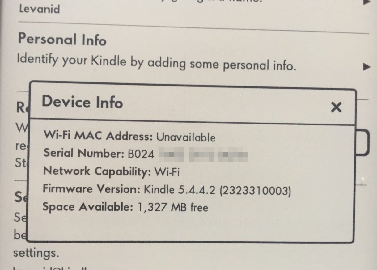 PW1 seems to become bricked after being connected to MacBook to place a file into documents and disconnected. At first device refused to open any book, lost it's wi-fi MAC address (see attached image) and after being rebooted it stucked on the kindle bootscreen (with a tree) and now is bricked ![]() It doesn't appear as a device on a mac or a winxp. But if the battery is totally drained (when device shows that the battery needs to be charged) device appears as a kindle drive which system unfortunately cannot access. As I see there is a thread here to unbrick older generations of Kindle is there something applicable for PW1? Is there any possibility to unbrick the device? I understand that it's quite old but anyway it bricked just after being connected to computer Kindle is valuable as it was a present.