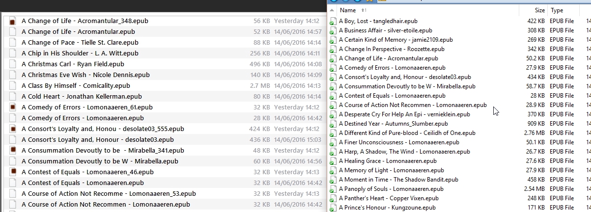Screenshot attached. The books dated yesterday in the screenshot were imported using the Calibre server and all have a suffix added to the name. iTunes does not add a suffix and the names are the same as shown on the right of the screenshot taken from File Explorer.
