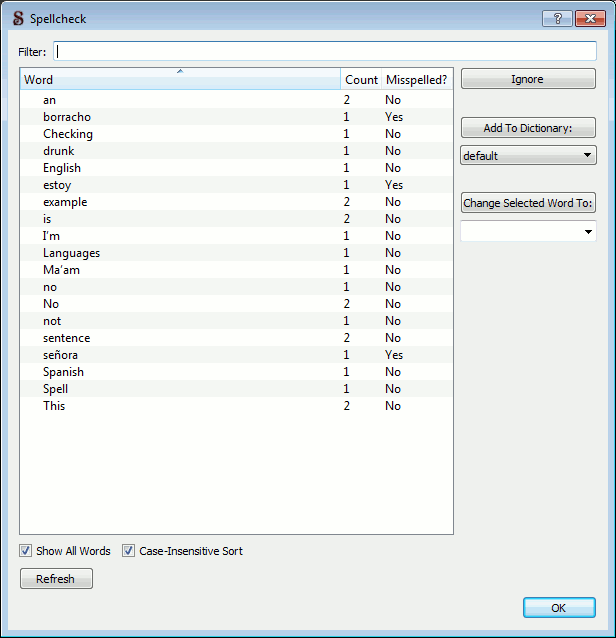 <p>This is an example Spanish sentence: <span xml:lang="es">No señora, no estoy borracho</span>.</p> <p>This is an example English sentence: <span xml:lang="en">No Ma’am, I’m not drunk</span>.</p> Why It Is Important Working with multi-language books, words may be correct in one language but wrong in another + quite often there are overlapping words ("No" in Spanish =/= "No" in English). Currently in Sigil, they appear in the list mashed together. Helpful Side Functionality It would be nice to be being able to double click on a word in a language and only jump to the position of the word in that specific language. I submitted a Calibre Bug Report + details in this thread: https://www.mobileread.com/forums/sho....php?p=3323463 Side Note Having Language in the Spell Check dialog was just one of those things that I previously thought was a teeny advantage in Calibre's favor, until I worked on a large book with thoroughly marked lang attributes. I suspect this case is relatively rare, but Calibre's Spell Check was very beneficial compared to my preferred tool (Sigil).