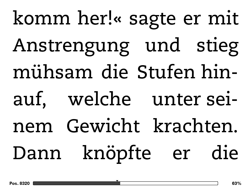 B should not be very difficult either - but it would remain to be seen how usable it is. Suppose that you want a font which is twice as large as the normal one: then there will effectively only be ~1/4th of the "logical" screen real estate available. The menus, book titles etc. might not fit on the screen anymore or be horrible squashed, button text might be truncated etc. So there is an upper "usable" limit for the font size, which remains to be found. Note that this concerns mostly the "OS" user interface; the reader should work ok even with extremely large fonts. See the attached screenshots (the first one shows the home screen in landscape mode; even with the normal font, the last entry is barely seen, and menus, detail screens etc. may also be "cut off" at the bottom). A should be doable as well, somehow, but will involve more effort. As TTS has been mentioned: it is already possible to enable TTS on all books usig JBPatch, and there are TTS packages for quite a few languages besides english. Of course, this also (only) goes for the reader application itself; something like a "voice guide" would be extremely hard to implement. Which kinds of handicap are we talking about? B and C sound like they're meant for people with impaired vision, while A sounds more like a feature for folks with impaired motor skills. Quote: