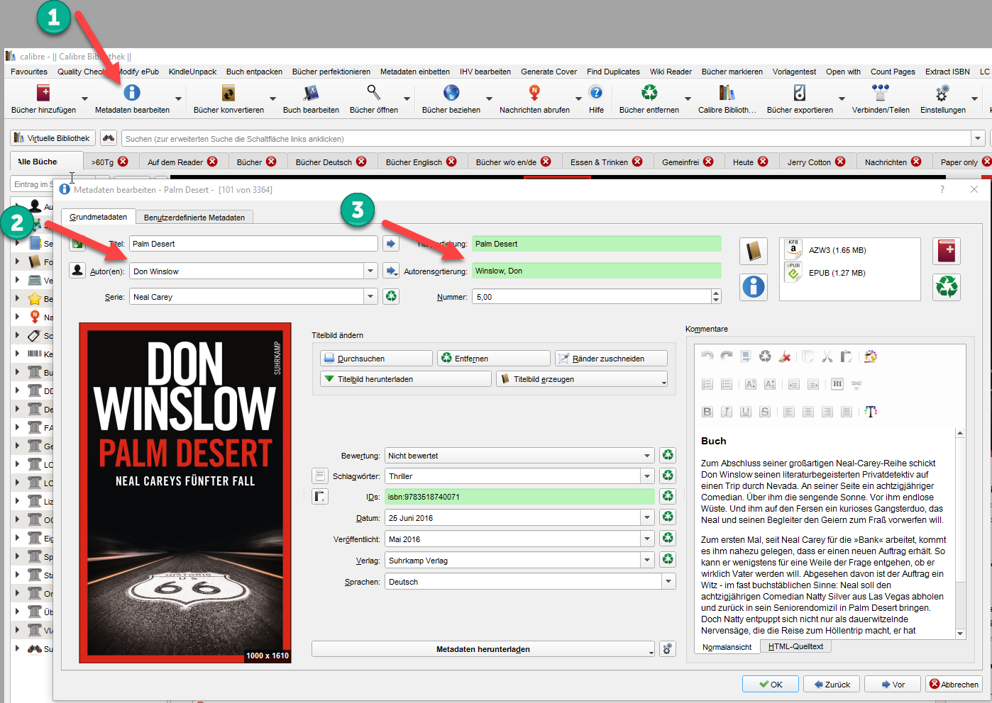You need first check your metadata. Maybe the problem came from there. Select one of the books in calibre and click on Edit Metadata (1). Then check the content for authors (2) and authors sort (3) as this is the basis for all other activities. If the data are correct (e.g. authors=Don Winslow and author sort=Winslow, Don) then the next step is to check your templates.