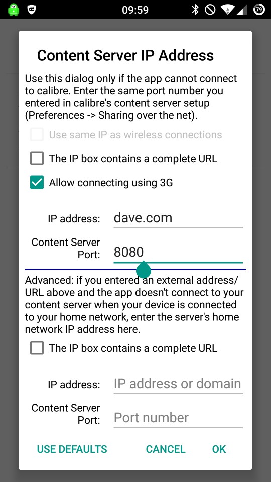 I have a calibre server set up to run on (let's say) dave.com. It runs a very standard service from the basic setup tutorial, runs on port 8080, and its also password protected. For SSL I use STunnel from port 44344 so that if someone goes to https://dave.com:44344 they get the username/password prompt and can log in and use the server via HTTPS. I would like to also get calibre companion to work with SSL/HTTPS. I can get it to connect properly using http on port 8080 using the following configuration: The issue is that nowhere in that configuration dialog can I find a setting for SSL, so as a result, I cannot figure out how to get it to recognize HTTPS, because this configuration: produces the following upon my attempts to connect: Any recommendations on how to make it work with SSL? Because I don't want to have to change my password after every time I connect over HTTP. Last edited by chaley; 04-25-2016 at 11:41 AM. |