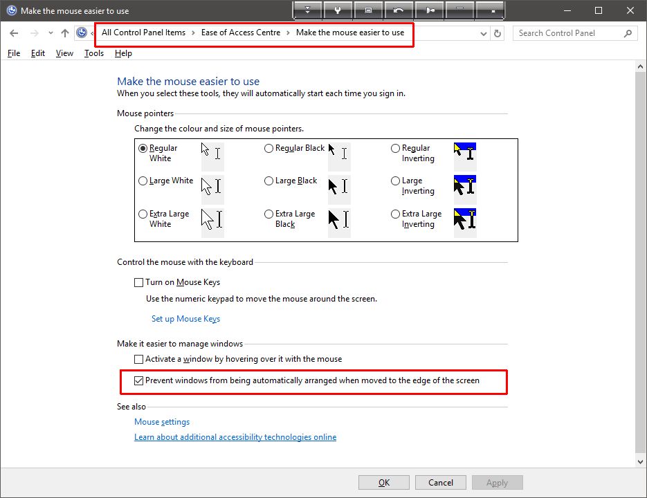 Why it's in Make the mouse easier to use is crap, I use it via the keyboard - WinKey+arrow keys. But the Prevent windows from being automatically arranged when moved to the edge of the screen setting disables it for the mouse AND the keyboard. IMO it should only apply to the 'M O U S E', just like it says on the tin. BR |