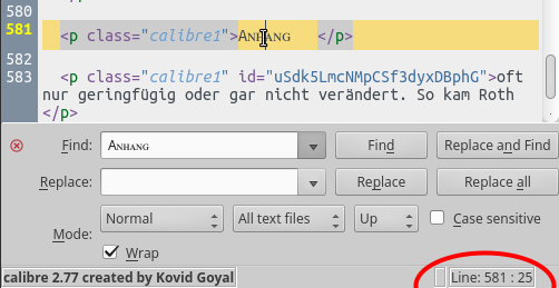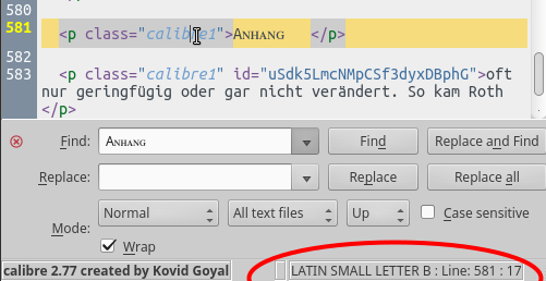 ![]() formatted characters I convert a .pdf to .epub. But some words are still formatted, e.g. ''Anhang''. I can not search for the word by writing ''Anhang'' in the Search(Find)-Box. ''Anhang'' formatted C&P the formatted ''Anhang'' I can search for it. Both cases allow to remove with S&R, but the formatted version only in whole code-expression: Code: