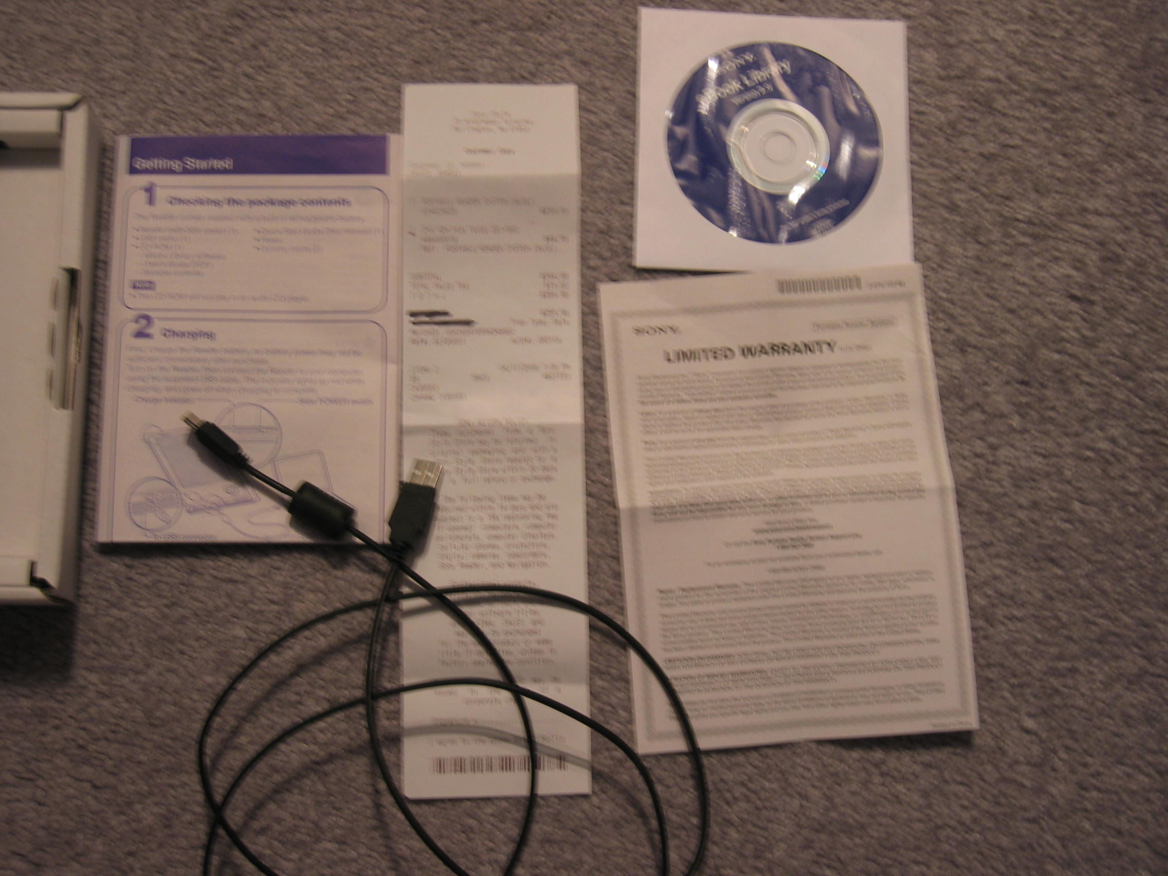 1. Sony PRS-505, blue, with blue cover 2. 2 Year Extended Service contract ($44.99 value) 3. Hand-stitched padded Sony PRS-505 carry-bag/ tote with strap (see attached photos) 4. All original documentation and packaging (box, instructions, EBook Library CD, warranty, USB charging cable) 5. Verilux portable reading light plus case 6. Pre-loaded books: a. After Dark by Haruki Murakami b. Books of Blood Vol. 1, The Great and Secret Show, The Thief of Always by Clive Barker c. The Last Unicorn by Peter Beagle d. The Dark is Rising Vol. 1 by Susan Cooper e. A Wizard of Earthsea- Ursula K. LeGuin f. His Dark Materials 1, The Golden Compass by Phillip Pullman g. The Ruins by Scott Smith h. The Restaurant at the End of the Universe by Douglas Adams Please look at the attached photographs, and e-mail me at Windupbird1214@yahoo.com with any questions. I will accept payment via PayPal, or if you live in or near Boston I could meet you and we could settle in person. Peace. David. |