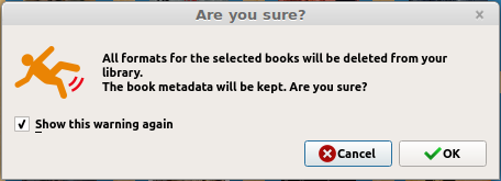 for deleting one of more formats for a book (also with multiple books) you do not have this warning. The process for this is slightly different. After initializing a delete action for a format, there is a additional window where you need to select the format(s) for deletion from a listing of available formats. After that the user have the choice to select the button Ok or Cancel. For me this is enough safety too. I am fully with Kovid. (But that won't help the questioner. His last safety net is the Recycle Bin, as BetterRed mentioned) |