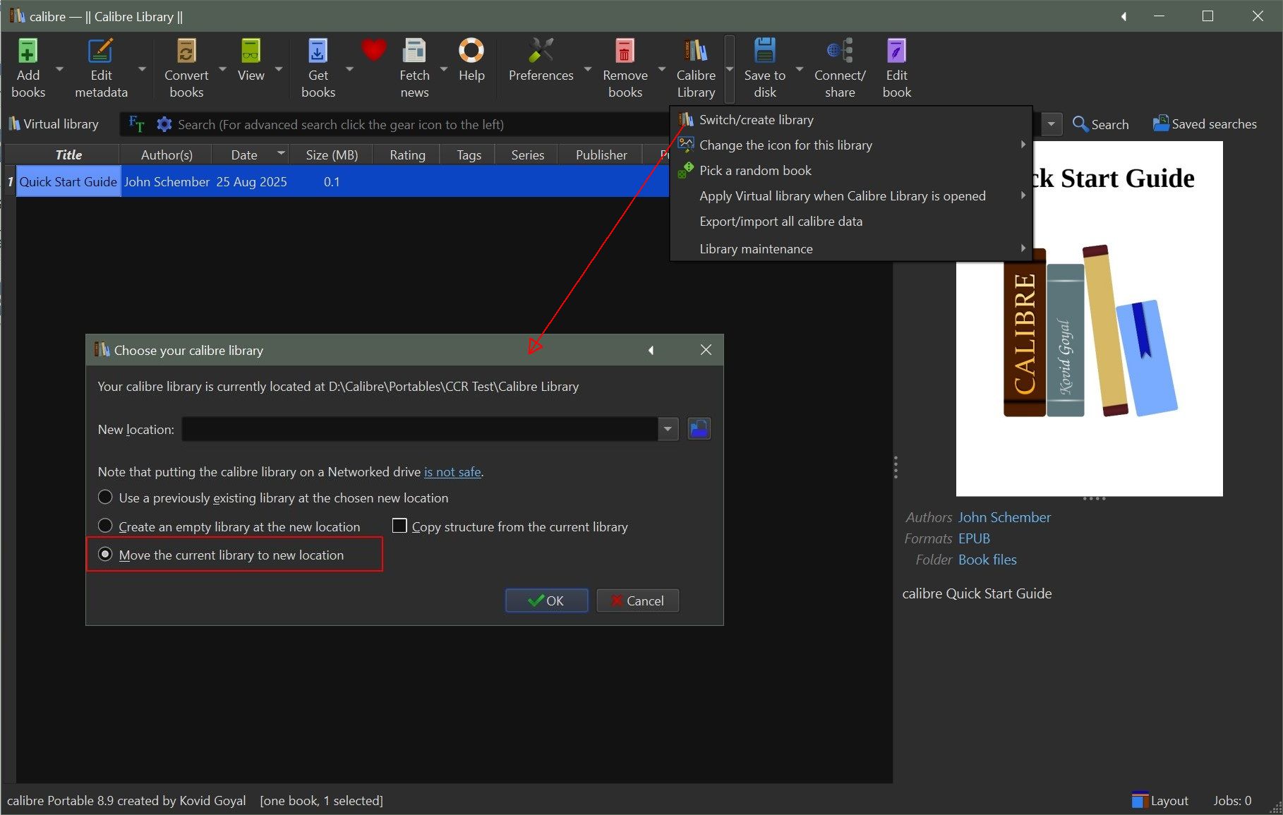 Moving the current library to a new location doesn't help because it's still just displaying the two books I recently tried to process--even though it did move over all the other books associated with those two authors. They're in the new Calibre folder, but they aren't displaying in Calibre, and none of the other books that were in my original Calibre folder were moved. From everything I've read, I'm thinking the problem may be with my metadata.db file, but I don't know how to open and fix it. |