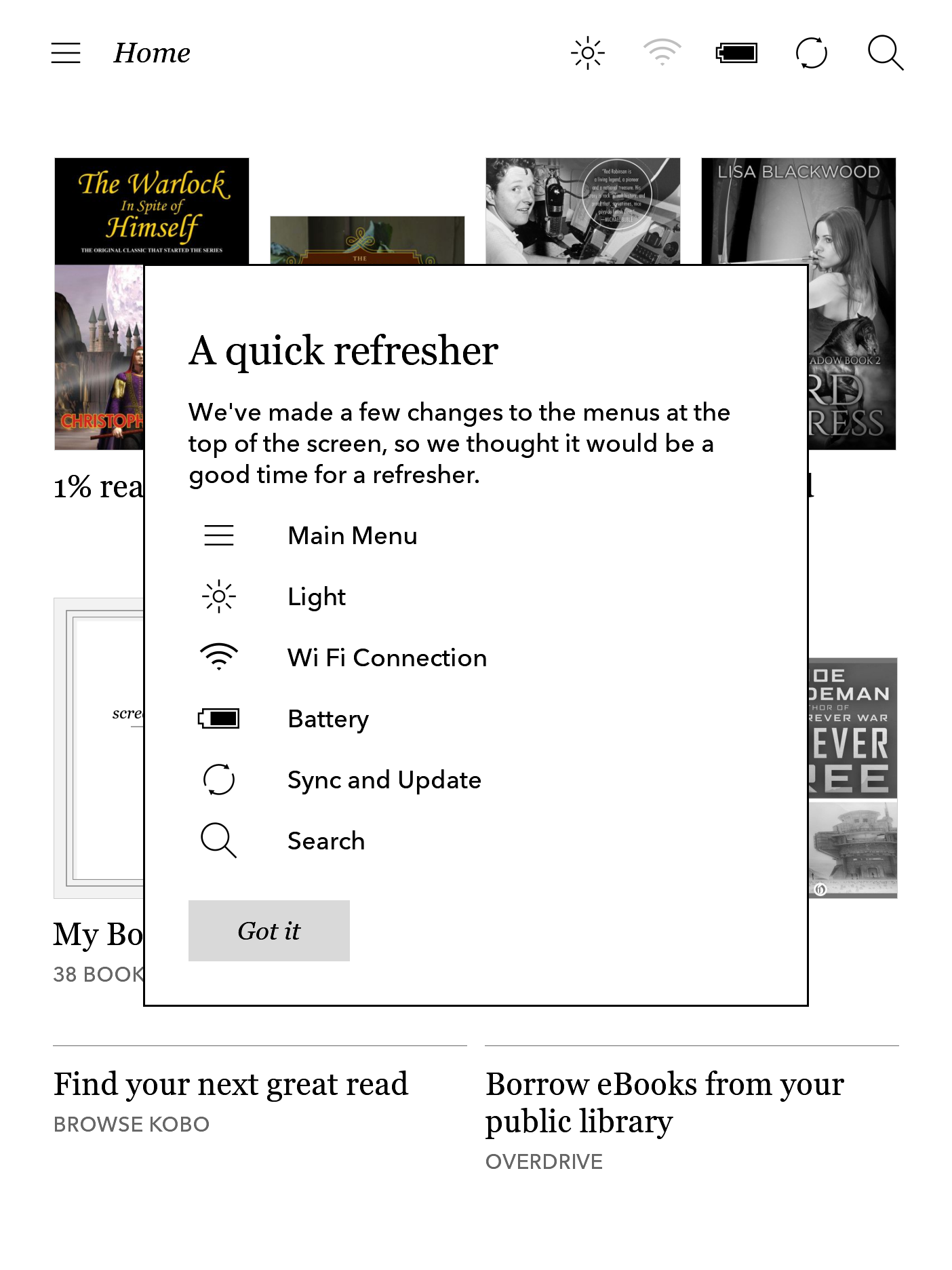 Here's a couple of screen caps from my KA1. The first is from immediately after the update when I had opened one book, after that I opened the maximum of 4 books that show on the home screen. My Books seems to sit in place but the Recommended will change to other blobs. Not sure if this version has the issue but the "A quick refresher" popup seems to show up on almost every power cycle.