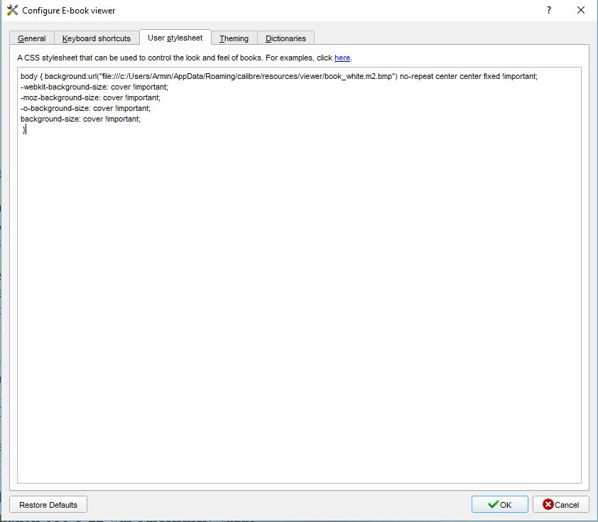 body { background:url("file:///c:/Users/YOUR_USERNAME/AppData/Roaming/calibre/resources/viewer/book_white.m2.bmp") no-repeat center center fixed !important;