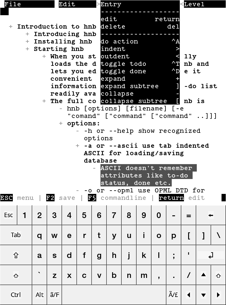hnb - hierarchical notebook.This is a 2003 vintage Linux command line utility. It allows you to create a list of notes indented to any level. Author: Øyvind Kolås. Website: http://hnb.sourceforge.net/ From the man page: "hnb is an ncurses program to organize many kinds of data in one place, for example addresses, todo lists, ideas, book reviews or to store snippets of brainstorming, to make a structured packing list or just to take random notes. It can export ascii/html/latex/postscript, supports todo checkboxes, checkbox trees with percentages and searching. hnb uses a simple ascii file for storing your notes. This file can be specified on the command line. If not specified, ~/.hnb is loaded (or created if missing)." Porting: Though the source code is available, I just extracted the binary from the Debian-Jessie-Armel repository, added a library file and dressed it up in a KUAL package! Needs: Jailbroken Kindle, KUAL, kterm. Should work on: All Kindles from KT1 onwards. Tested OK on: PW1, PW3, KT3. Installation and usage: