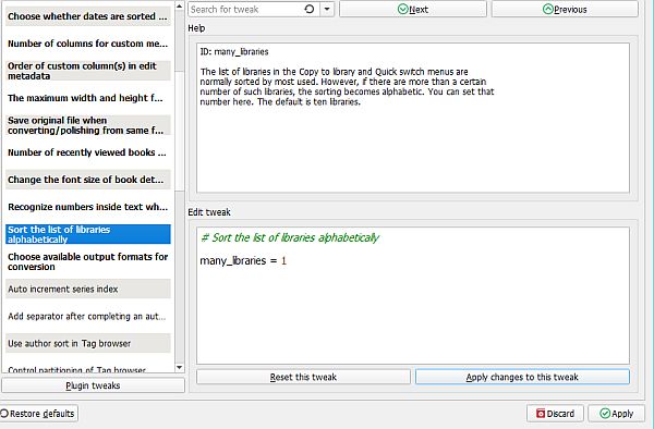 Since I want certain libraries at the top of my list, I had the tweak set to sort the libraries alphabetically when there's more than one. I then added a letter at the beginning in the order I wanted them. The images show the tweak setting, the libraries in Quick Switch, and the libraries in Copy-to-Library. As you can see, it puts B at the end, after Z. The other Copy-to-Library screen has a check box to sort alphabetically, so that one is fine.