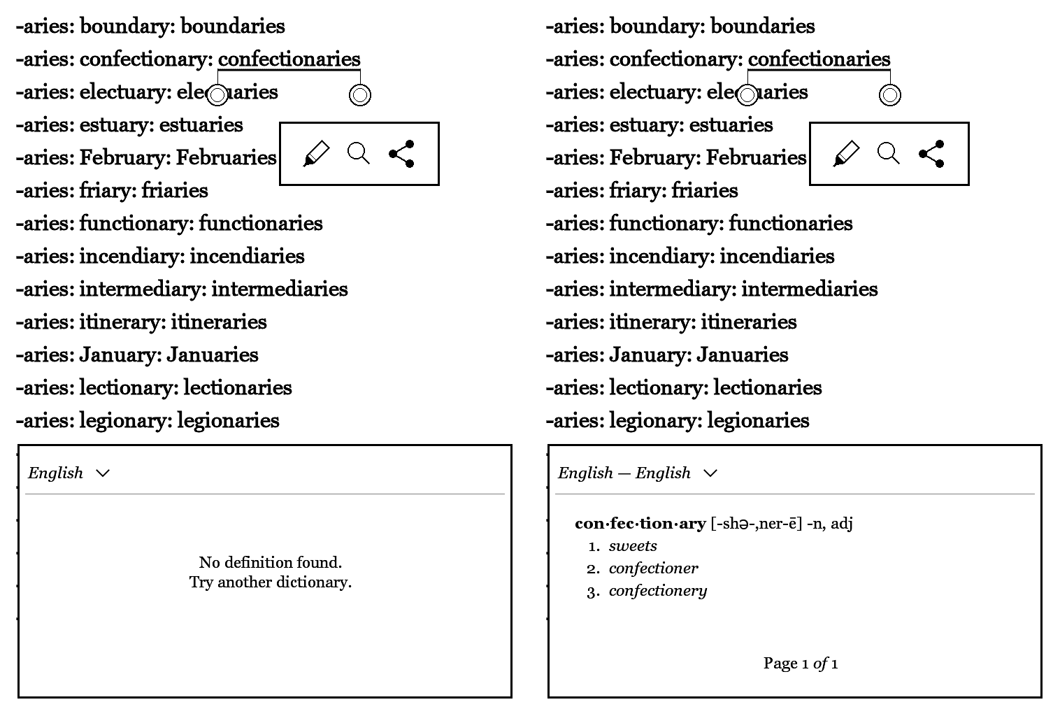 I would like to mention that the performance of the English definitions dictionary (and presumably also of other dictionaries) could easily be improved by making better use of the variants that are recorded in the dictionary. Currently, variants seem not to be taken into consideration, when they are available only in abbreviated form, like "-aries" in the case of "boundary". To check this, I went through the dictionary and resolved the abbreviated variants. I add some images for illustration.