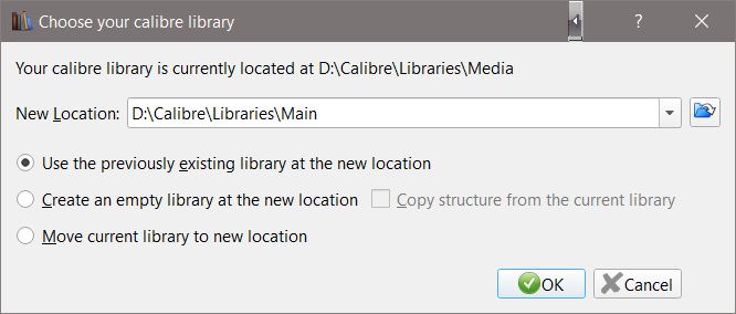 @phamley - I suspect you may be misreading the term "New location". The adjective 'New' reflects the status of calibre's recording of its libraries in its gui.json file, not the status of folder/directory in the file system.