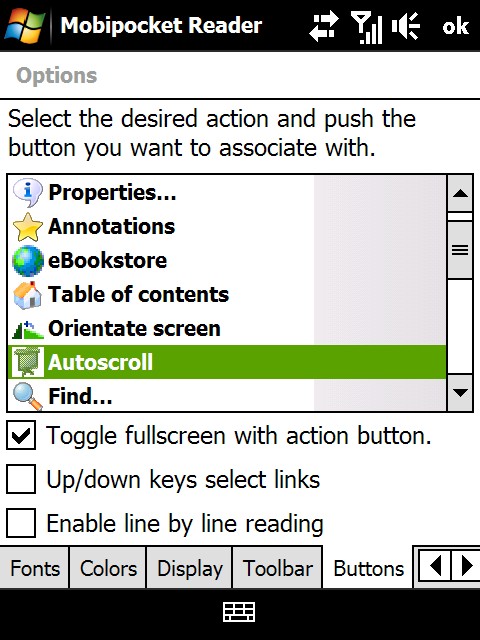 I'm trying to set the keys in MobiReader (runnning HTC Touch Pro) and I am faced with this screen: However, when I press any one of the "soft buttons" (home, hang up, up/down etc) it instead does the actual action. I am a bit of a newcomer to the windows mobile world so I might misunderstand the meaning. What do you think? |