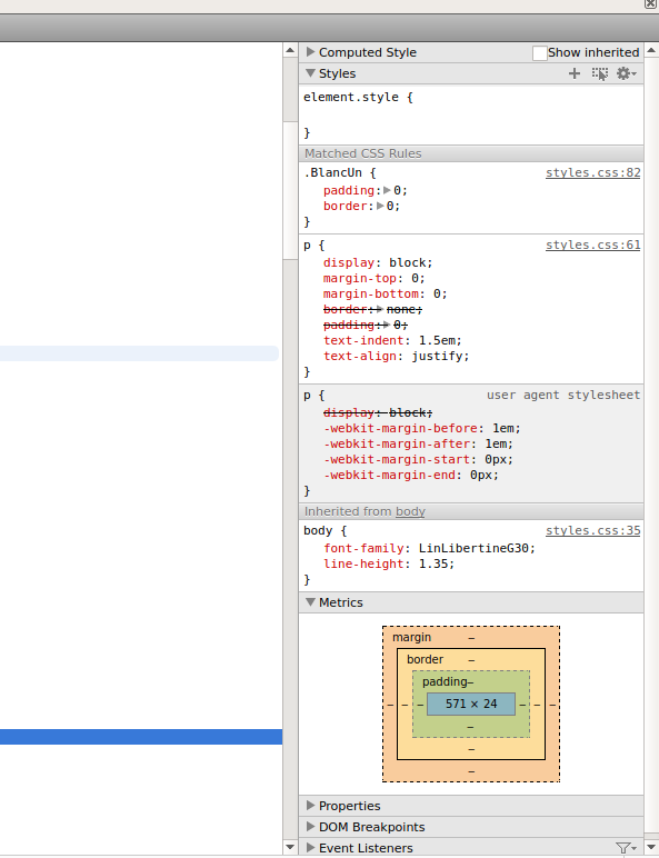 I format ebooks using styles. I use a main textbody paragraph style. Nothing unusual. ![]() Sometimes, it's required to mark a breathing space between text paragraphs. The non-recommended (dirty?) way to do it is to add an empty paragraph. Easy, you just click "Enter" in a text-processor and get a <p> </p> in your html (or many if you click several times). You also can try to do it in a "cleaner" way - either using a slightly modified textbody style, incorporating a bigger margin-bottom value of some pixels. You need to make use of two styles (or of two different classes). - or by creating a dedicated "space" paragraph. To avoid it to be empty, you can insert a nobreak space. You give it a class name (say "BlancUn"), provide this css class with some margin and padding values. Either way, when you display it, you may realize using the Inspector of the Calibre editor, that you do not get the exact vertical margin width you were aiming for because a 1em -webkit-margin-before and a 1em -webkit-margin-after seems to be systematically added by the so called "user agent stylesheet" (see screenshot). This spoils the space display if you wish to use only a small value. I'd like to know if this user agent values are only a Calibre editor peculiarity or if it will be met elsewhere with common ebook-readers. Maybe the optimal way to deal with this would be to add some null webkit margin values in the css? Last edited by roger64; 01-04-2018 at 09:45 PM. Reason: optimal and -webkit |