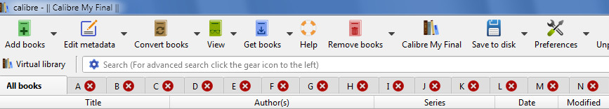 I just updated from 2.78 to 3.15.0, and all seems to be OK. In 2014 I was trying to motivate the expert people to improve the Calibre with the following addition (https://www.mobileread.com/forums/sh...d.php?t=245434) saying: …with Calibre database getting bigger it is becoming increasingly difficult quickly reaching the required Author or Title etc. I believe it would be quite helpful to have a permanent horizontal strip of buttons alphabetically organized, just under the main tool bar, something like: A B C D E F G H I J K L M N O P Q R S T U V W X Y Z… Kovid suggested this: Use the virtual library feature for this. Create virtual libraries with the searches title:~^A title:~^B title:~^C and so on, then enable the virtual library tab bar and there you go. I implemented it (I used Author:~^A etc., not title) and am using it since, even though there are some limitations like e.g. those "Close Tab" Xs if accidentally clicked, which also make the bar much longer… Over the years this horizontal strip of alphabetic buttons proved to me very useful when listing through an extensive author database and I am quite surprised nobody tried to implement it as a selectable bar in Preferences! Here is the example how it looks: Last edited by Bigo2; 01-19-2018 at 12:13 AM. |