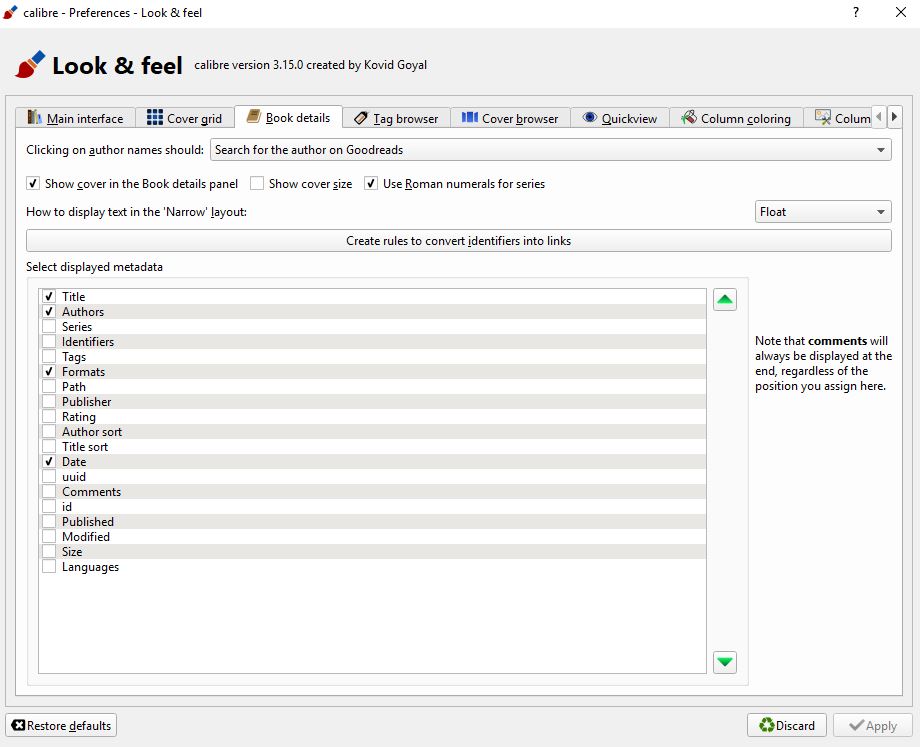 Win 10 Home Premium (I can't find the version) Yesterday the detail panel disappeared while I was doing something in Windows File Explorer. I wasn't touching Calibre at the time tho it was open. I don't think I am crazy. I have been using Calibre for years and never experienced anything like this. Restarting Calibre or restarting the PC have not helped. I have included what I think is the correct tab in preferences. It looks to me that everything is in place. Does anyone know what happened or how to fix this? Richard |