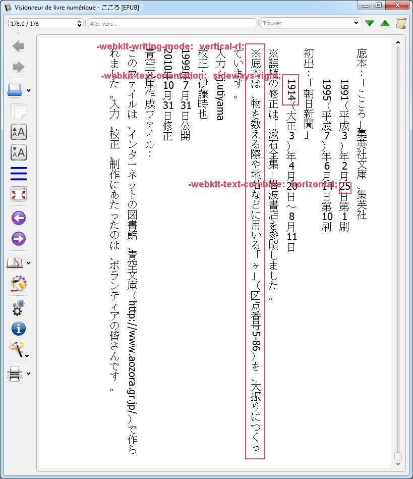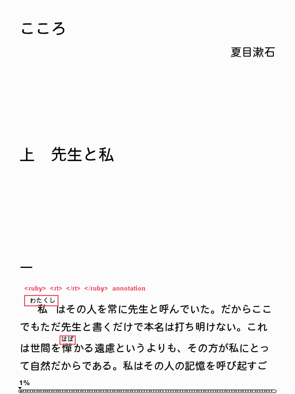 I recently came across a bit of software AozoraEpub3 which can convert Aozora .txt files into epub3 format files. See the following link for more information http://blog.preining.info/2013/01/10...nts-to-kindle/ it can produce either vertical and horizontal format files, depending on settings, and can also be set to exclude images. It also seems to handle ruby text when present. As the interface is in Japanese, the above link is useful for explaining how to use it - although as icons are used a lot some functions can be guessed at. Once an epub3 format file is produced, this can be run through kindlegen to produce a version for a Kindle. Using this I have been able to produce vertical text books for my Kindle White. These also include the ruby text. Pages turn from right to left as expected when going "forward" through the book. The other bonus of this is that by looking at the contents of the epub file one gains an idea of how to create a vertical text format book - which can be applied to one's own material. |
