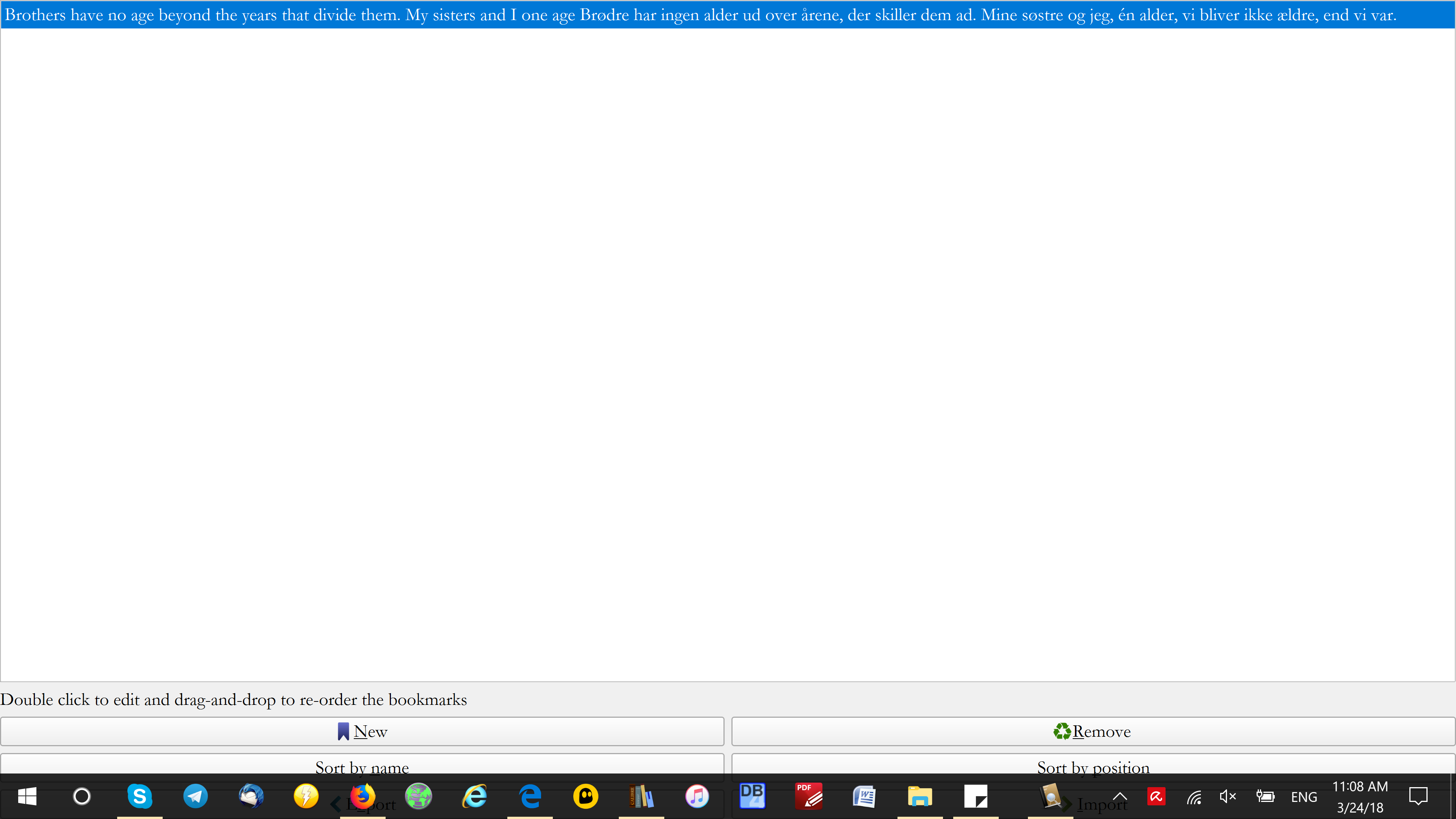 Hi all, I'm using Calibre 3.20. I opened a book in the e-book viewer and made a bookmark. Now the bookmarks page, which lists all my bookmarks, fills the screen (screenshot attached) and I can't read anything. In fact, whenever I open any new book now in the e-book viewer, it opens on the bookmarks (even if it is a new book and I have no bookmarks yet). Help: How can I reduce the size of the list of bookmarks? Or how can I close/open the list of my bookmarks? Thanks, Furphy
