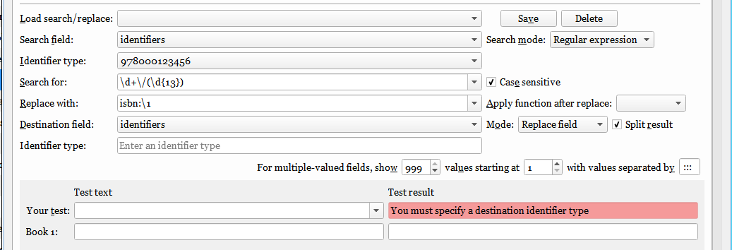example type: 978000123456/978000123456 identifiers:"=urnisbn/978000123456:" identifiers:"=urnisbn/:" is there a search/replace regex or a way to keep the isbn and removing part of identifier or change. 978000123456/978000123456 >>> isbn:978000123456 urnisbn/978000123456 >>> urnisbn:978000123456 if anyone have another rules to share about managing identifier is welcome. |