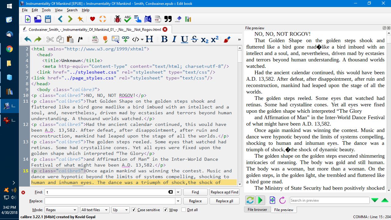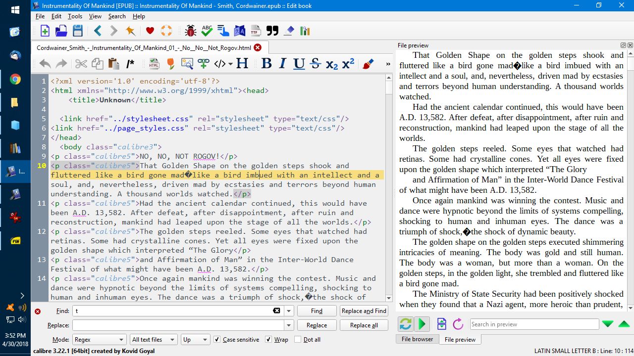 I've known for a while that if you get a parsing error (tag imbalance) that sometimes a black diamond with question mark shows in the text. This does not happen with every parsing problem, not sure what causes this to appear. This time, I had something really weird happen, that I've never seen before. The file I was practicing with obviously had some processing problems from previous editor: some word spacings were deleted where they shouldn't and two words were stuck together in many locations. I only noticed that this early in the editing process (spelling check usually is my last step) because that is where the black diamonds showed up. What caused the black diamonds to appear: I deleted the initial span-tag at the top of the page. This caused parsing error, and the diamonds appeared (Pic1) ![]() ![]() The black diamonds showed only in the preview screen, not in the editor screen. Because the diamonds do not appear in the editor screen, I cannot search for them. When I find one in preview and push delete button in the corresponding editor position, the cursor does not advance, but the black diamond in preview disappears. ![]() ![]() Even stranger, when I used 'auto correct errors' (which just deletes the superfluous end tag and removes the error, which normally makes the diamonds disappear) the diamonds not only stayed in preview, but also appeared in the editor (Pic2) And because they did show in the editor now; I was able to use the editor to get rid of them all at once. I have attached the file that showed this problem. It is an incomplete (less than 1 chapter) extract from a book that I use for self-education practice with the editor. The diamonds appear by removing the initial span tag after the title. They stay even when the final closing tag is removed. QUESTIONS: 1. Why do those diamonds only appear in a (very small) minority of files with parsing errors, not in others even though they may have similar errors. 2. What's up with the invisible character? Before today, if they showed, these diamonds always showed in both editor and preview screens. This is new. Not only invisible, but also not taking up any space in the editor? Is that possibly a bug? Comments invited and appreciated. |
