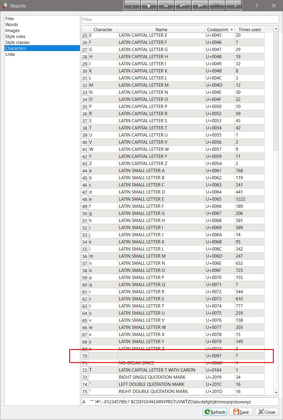I wonder why I see it in the editor section and reports, but not the preview window? If I search for \u0097 in Regex mode it matches the character. Last edited by DoctorOhh; 05-01-2018 at 04:04 AM. |