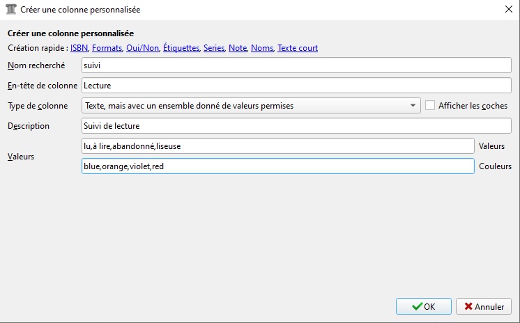 Le chapitre 'Store/record current reading position for ePubs' décrit les fonctionnalités du plugin. Si vous souhaitez avoir une colonne contenant le pourcentage de lecture, vous devez créer une colonne de type 'Entiers' (voir type de colonne capture d'écran de mon message précédent) Icône Préférences -> Ajouter vos propres colonnes -> Ajouter des colonnes personnalisées -> 'Type de colonne' sélectionnez Entiers avec par exemple dans 'Nom recherché' pourcentlu et 'En_tête de colonne' Pourcentage lu Ensuite dans la fenêtre 'Personnaliser le plugin' de KoboUtilities, sélectionnez #pourcentlu pour 'Colonne de pourcentage de lecture'. Puis, je suppose que lors de la connexion avec la kobo, l'option 'Store' permet de récupérer depuis la Kobo le pourcentage lu pour les livres sélectionnés, l'option 'Restore' appliquant le pourcentage présent dans Calibre sur la Kobo. Pour mon suivi de lecture j'utilise une colonne personnalisée que je renseigne manuellement. Icône Préférences -> Ajouter vos propres colonnes -> Ajouter des colonnes personnalisées -> 'Type de colonne' sélectionnez Texte mais avec un ensemble de données permises. |
