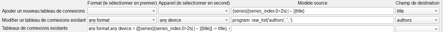 First, to answer your questions: - Yes, I saved the plugboard. When I enter again, I see the picture 3 I attached. So this seems to work fine. - Regarding my library. As overview of one author, I attach picture 1, so you see that all names are fromatted with "Last Name, First Name" format (including a space after the comma) - If I open the metadata of one book, I join picture 2, I think that the author's name is corresponding to the author's sort (as it is green). Do you see something wrong there in? I'm unable to see where the mistake can come from. Now I tried again to export and I see that: - The title does not contain the series anymore. Before I had "Daniel Knox 1 - Title of the book". After the change, I do not have anymore the "Daniel Knox 1" but only the title of the book. - And guess what? The autor in the authors tab is still split. Now as I'm trying out several possibilities, two questions raised: - Can it be that my "old" version of Calibre interferes there? I'm still on a 2.64 version which worked really fine with the old firmware I had. - Regarding the metadata plugboard: the tool gives me two possibilities: either to create a new one, or to adapt the existing one (which is set up for any format and any device). What should I choose? For the moment, I modified the old one, means that on the left side, I have one single line telling any format:any device = ([{series}{series_index:0>2s| | – }{title}] -> title), ([program: raw_list('authors', ', ')] -> authors) But it seems that the combination of the two arguments cancel each other as after the modification, I do not see the series name anymore into the title. Should I create a new one? I tried to think about it, but Calibre does no let me create a second table for the "any format:any device" selection. Means that I would have to choose another combination. Could "epub:Kobo" for the author be the right one? Again ... thanks a lot for your support |