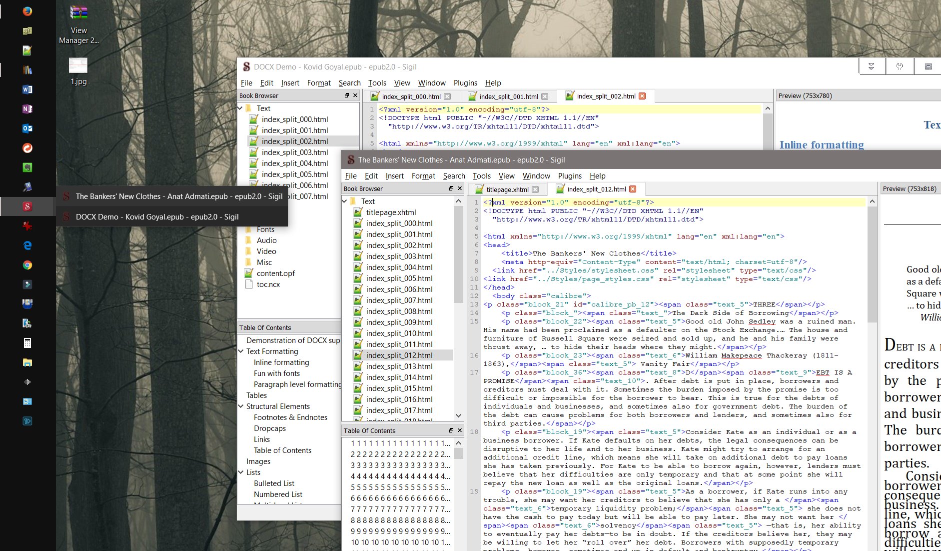 FWIW - I use an Office Addon (Office Tabs) that gives me an tabbed single-instance/multi-document interface for Word, Excel and Powerpoint. The existence of something similar can be the deciding factor when I'm choosing an application. How would a single instance multiple epub version of Sigil present itself? A dockable Epubs Open window with a vertical list would be my preference. BR Last edited by BetterRed; 07-15-2018 at 09:44 PM. |