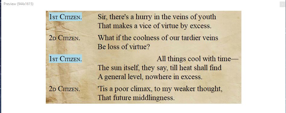 The highlighted portion looks like someone was just marking the book so they could memorize their lines... ![]() If you don't want to replicate the highlight, you could simplify the code like this: Code: