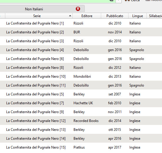 I have changed them all to Italian and now they are sort correctly... I have the same problem with another short series, actually, where I have the first two books in Italian, and the third in english, and they show the same issue. This time, though, the books truly are in two different languages, so I can't just "fix" metadata... And anyway, how come series ordering is being messed up if some books in the series have a different language? And not in a simple way: for example, here: it's not that some languages are put after others: english books are put after italian books if you look at the picture. But italian and spanish books are mixed together, so it is not even predictable how the would end up... Is it? This looks kinda weird to me: the language a book is in should not related to the ordering the book has in a series, since there is "series_index" that does the job... |