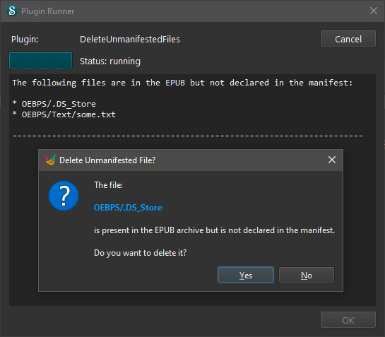 Current Version: "0.2.9" Plugin type: edit Plugin icon: This simple plugin will delete files that third-party apps might write to the ePub temp folder. Please note that this plugin will delete all unmanifested files, except for files that are mandatory for EPUB files, i.e. mimetype and OPF, as well as all files located in the META-INF folder. For example, it won't delete com.apple.ibooks.display-options.xml. Credits/Thanks:
