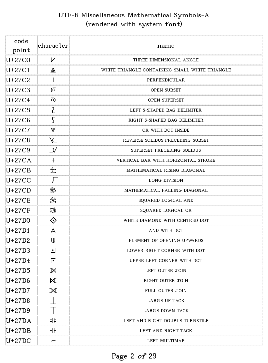 The fault in our fonts... (may John Green forgive me). Edit: Attached a zipped copy of code2000.ttf to the message. A bit of an ugly font but it does display almost the entire glyph set. Edit2: Checked and the glyphs in code2000 only work up to 2B54 in the miscellaneous symbols and arrows area but then it was designed in 1998 with Unicode v2.x being the current version. Last edited by DNSB; 09-09-2018 at 03:50 AM. |
