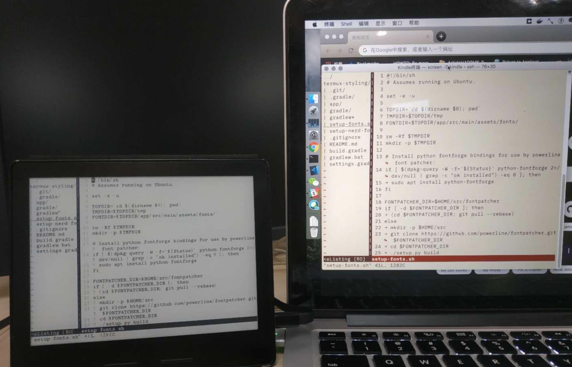 The core idea is setup sshd on PC, then connect kindle using usbnet, and from kterm ssh back to PC then start screen to attach existing session. Here is the details: 1. setup sshd, setup ssh key pairs, put public key to $HOME/.ssh/authorized_keys 2. On PC, start screen with a named session - kindle Code:
