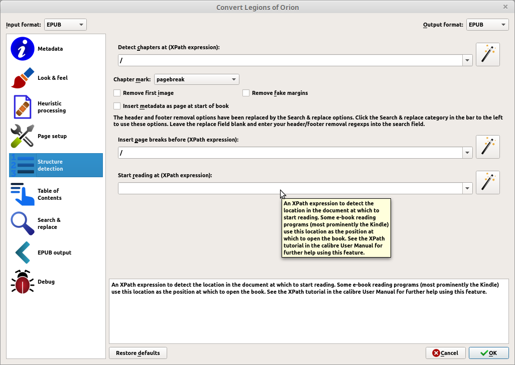 <reference type="text" title="Beginning" href="001.html#a0"/> The question now is, can I automate this substitution when importing the .epub file into Calibre? (And if yes, how?) thanks for any hint how to achieve this. Thomas |