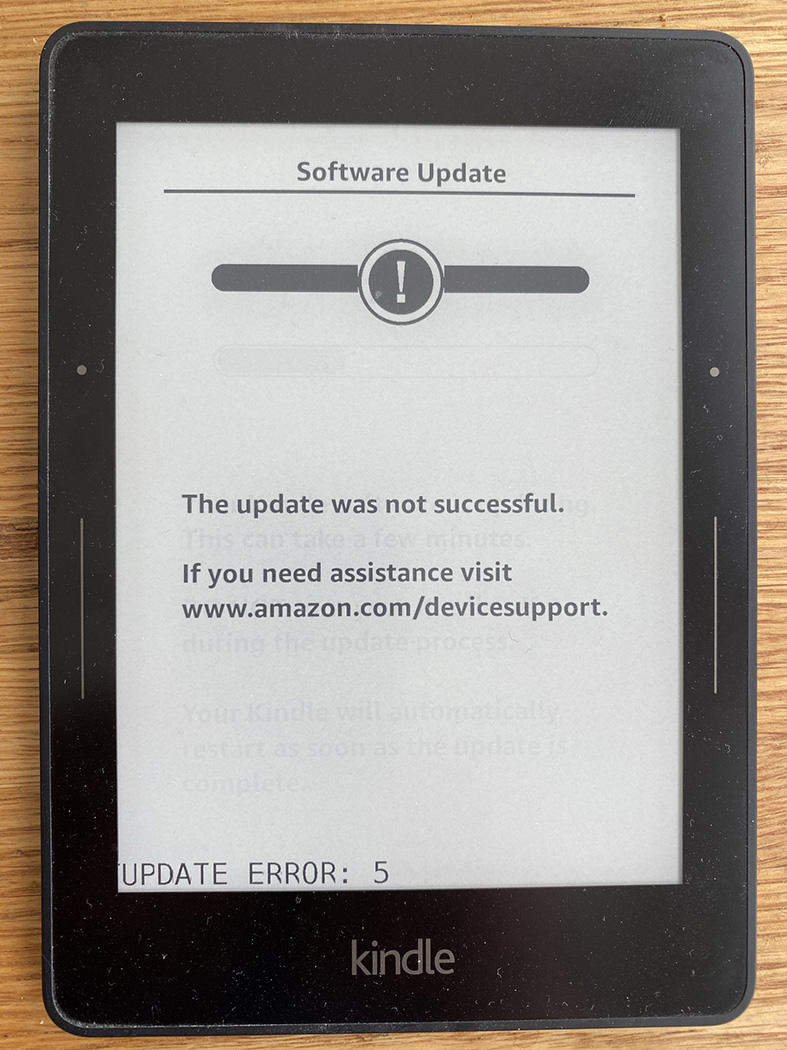 If I hold the power button for 40 seconds the only thing that happens is that the update restarts and get stuck at the same screen again. I have been searching for "Update Error: 5" but I can only find "there is not enough storage space for the update" - however since I cant access the Kindle in any way I cant clear space. And there was a lot of space free before the update. Any hints or suggestions ? Last edited by issybird; 03-12-2021 at 09:22 AM. |