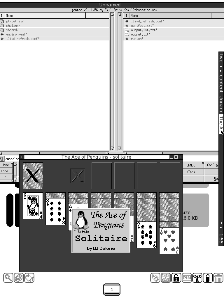 [04/02/2008] Thx Adam for moving this thread to the software release section & starting the thread Card Games for your iLiad. The not easy part of porting was to find the right place in src for the hack "Dialogs open as a window in iLiad's window mananger matchbox". It was hidden in the library, which use all card games. [The old teaser screenshots were created with running wm fluxbox.] specific stuff for game "Solitaire" : I choosed the connection "full screen refresh" to the dragging event [= you move stylus on screen; so [double] clicking is possible w/o triggering a full screen refresh] because the most action is when you move a stack of cards to another place. Draw a line on screen for full screen refresh. on the to-do-list: # remove usage of hacked libX11 [only Solitaire doesn't use it] # some games need right mouse button # disable LED blinking # the green background colour doesn't look nice on iLiad's screen I'm testing the Ace of Penguins [a bundle of 11 somehow solitaire games]. I was never a fan of solitaire, but it's quite cool on iLiad. A nice timekiller. screenshots: #1: game Solitaire, filemanager gentoo, windowmanager fluxbox #2: Uhhh. I won a Solitaire game. #3: Oh no! I clicked in Minesweeper on a bomb. Last edited by yokos; 04-02-2008 at 11:39 AM. Reason: EDIT 04/02/2008 |