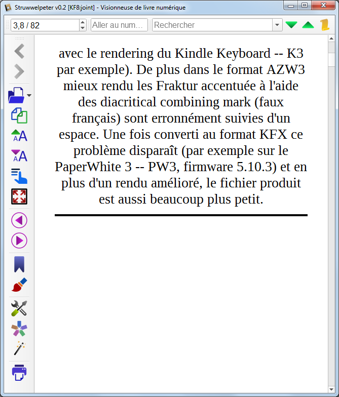 To give it a Germanized look I decided to code the text using the "Fraktur Bold" letters in the "Mathematical Alphanumeric Symbols" of the Unicode block (U+1D400..U+1D7FF) embedding a publisher font since no native font of the Kindle support this block. Not using Unicodes from the "Basic Multilingual Plane" (BMP) proved a challenge... Expectedly, this MOBI badly tricked the K3: On the PW3 the MOBI introduced unwanted blanks after accenting Fraktur letters with diacritical combining marks: But converting the MOBI to KFX perfectly fixed the rendering: Find my sources here: |