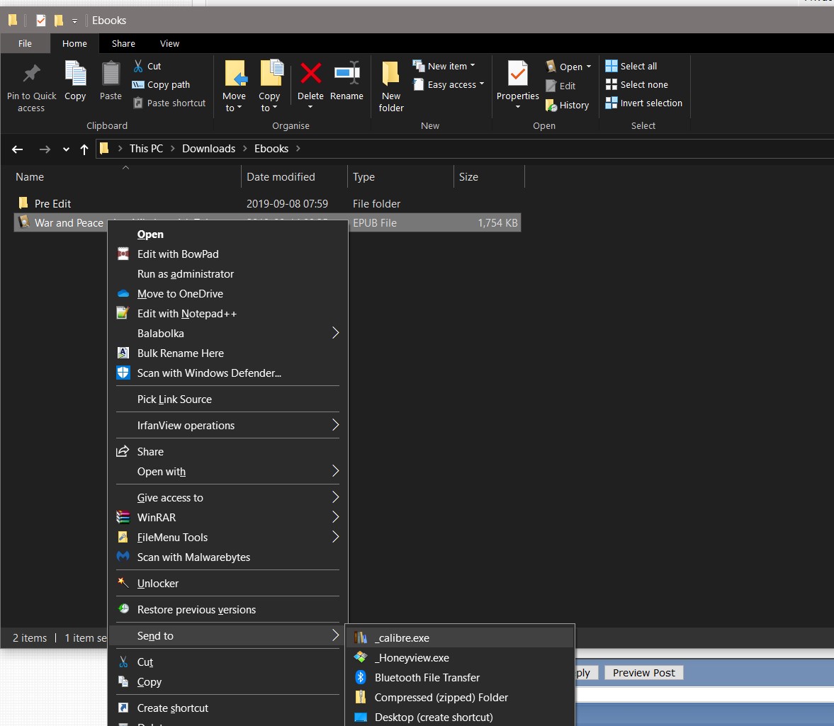 If it's not already running Calibre will start, and the selected files will be added. I have --with-library "D:\Calibre\Libraries\Intake" in the shortcut, if calibre is already running I make sure it's using the Intake library before I use Send To->calibre.exe. MS should put a Send To drop down alongside Move to and Copy to for the ribbon clickers. To open your SendTo folder, press Winkey+R, type shell:sendto, press OK. BR |