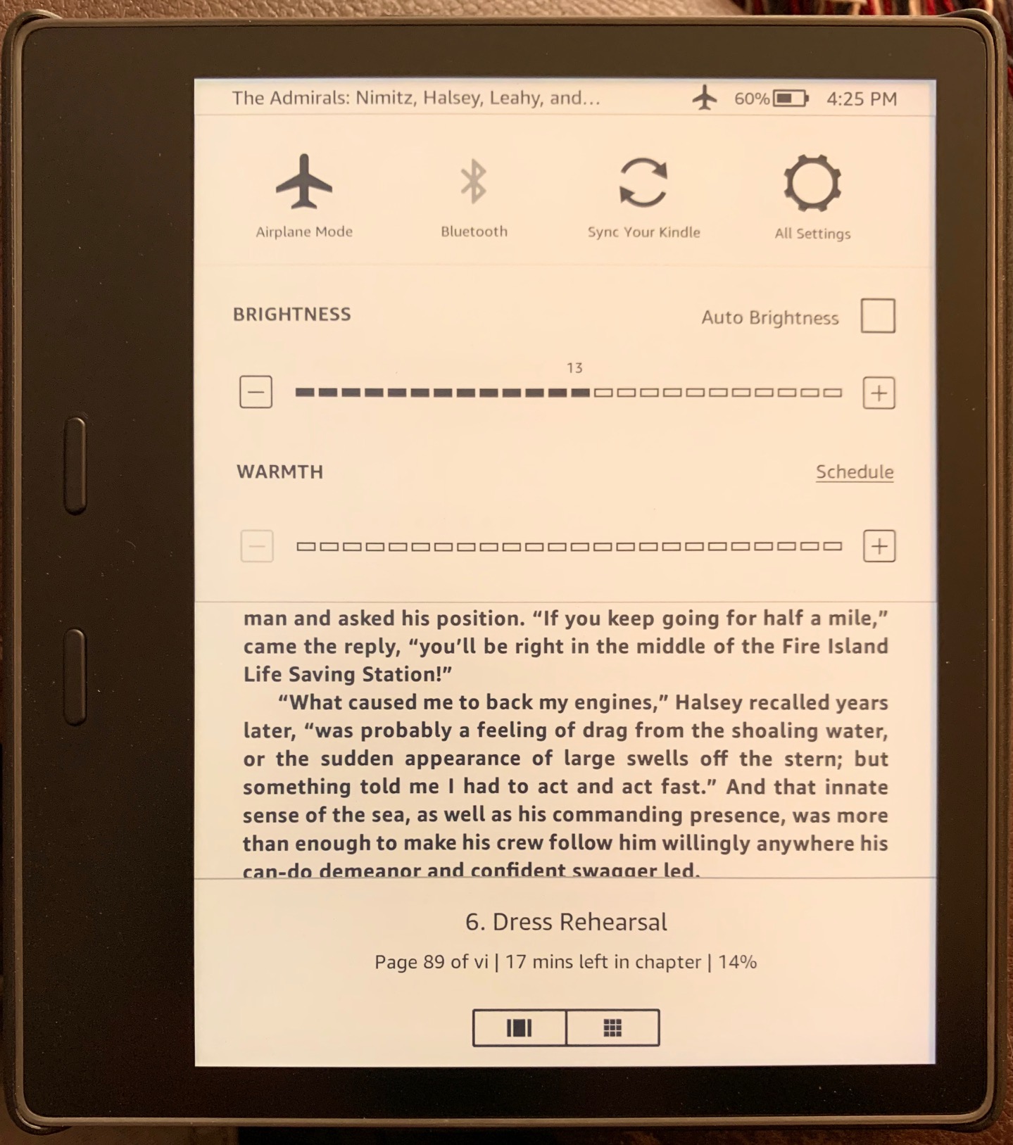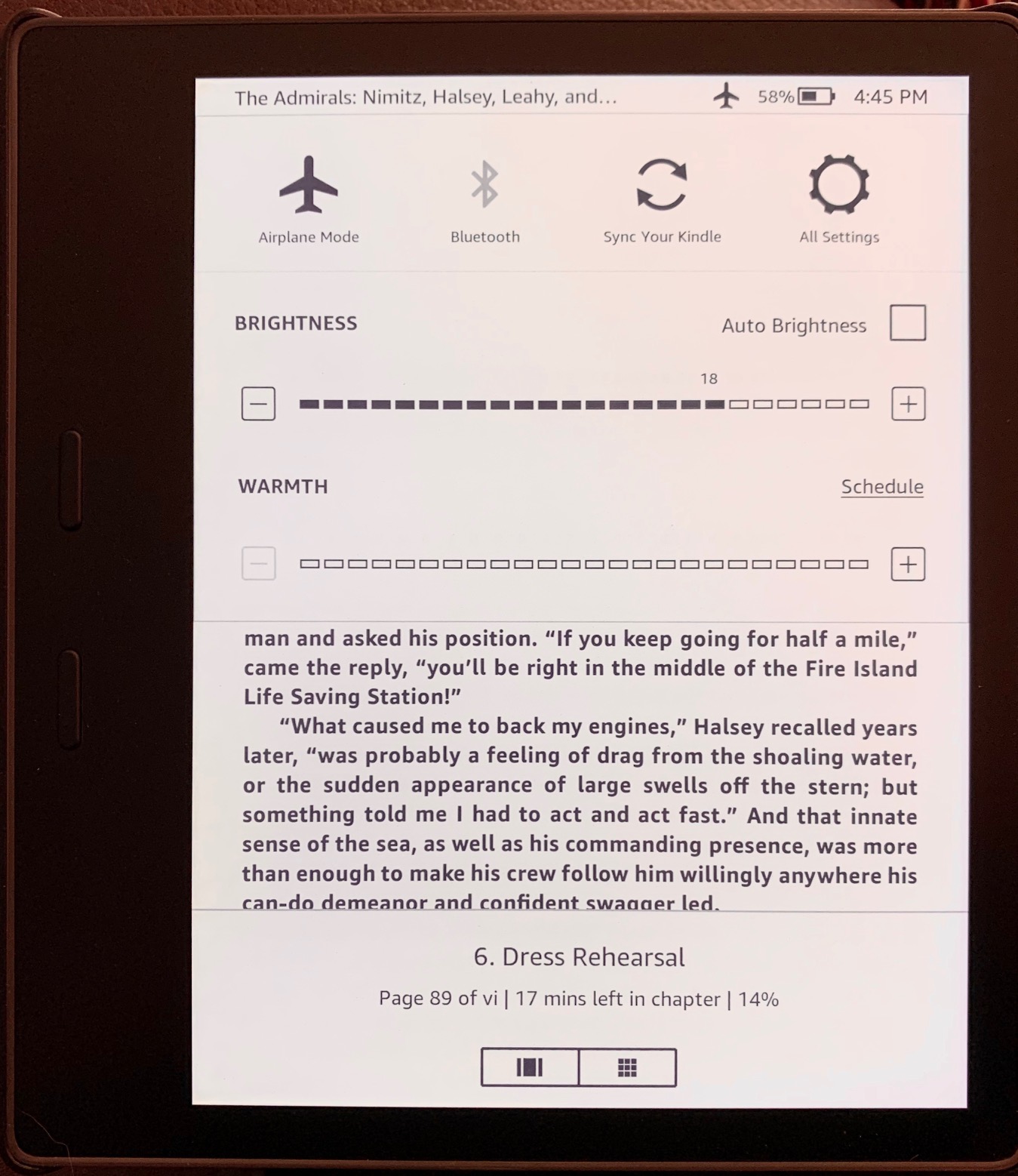 Just posting this as it shows clearly the sepia tones of my Oasis 3. This is it at brightness 12 and warmth OFF. I was going in to the menu to reduce the warmth, as it is now daylight here, and was surprised to see this as the coolest it can go. I personally love the sepia look, but I appreciate it’s not for everyone.
