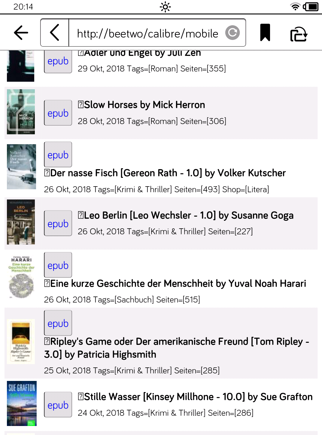 Since the tolino can't display the default view (perhaps because of javascript etc.) I use the mobile view in this case. This looks more or less usable but I wonder why there is this question mark symbol as a preceding every title. My first guess is that this is a character which isn't available in the font the tolino browser uses. But on my mobile phone there isn't shown anything special at this position. So why is that?