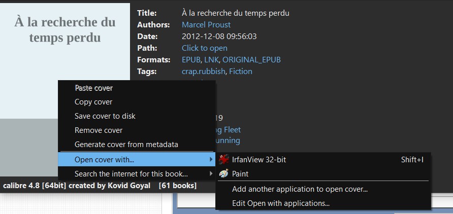 The context menu in the book details cover has various options, including Open With your favourite image editors: BR |
