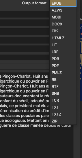 Merci pour tous tes éclaircissements . J'ai vérifié les output format. Tjrs pas de KEPUB. J'ai pourtant téléchargé la dernière version 4.8 (je suis sous iMac, c'est peut-être çà la raison). J'ai trouvé une combine dans le menu CONVERT BOOKS sous menu EPUB output dernière case en bas Options specifics to the Output Format. Je tape KEPUB et çà à l'air de fonctionner. (Dans la liseuse le format devient KOBO EPUB).