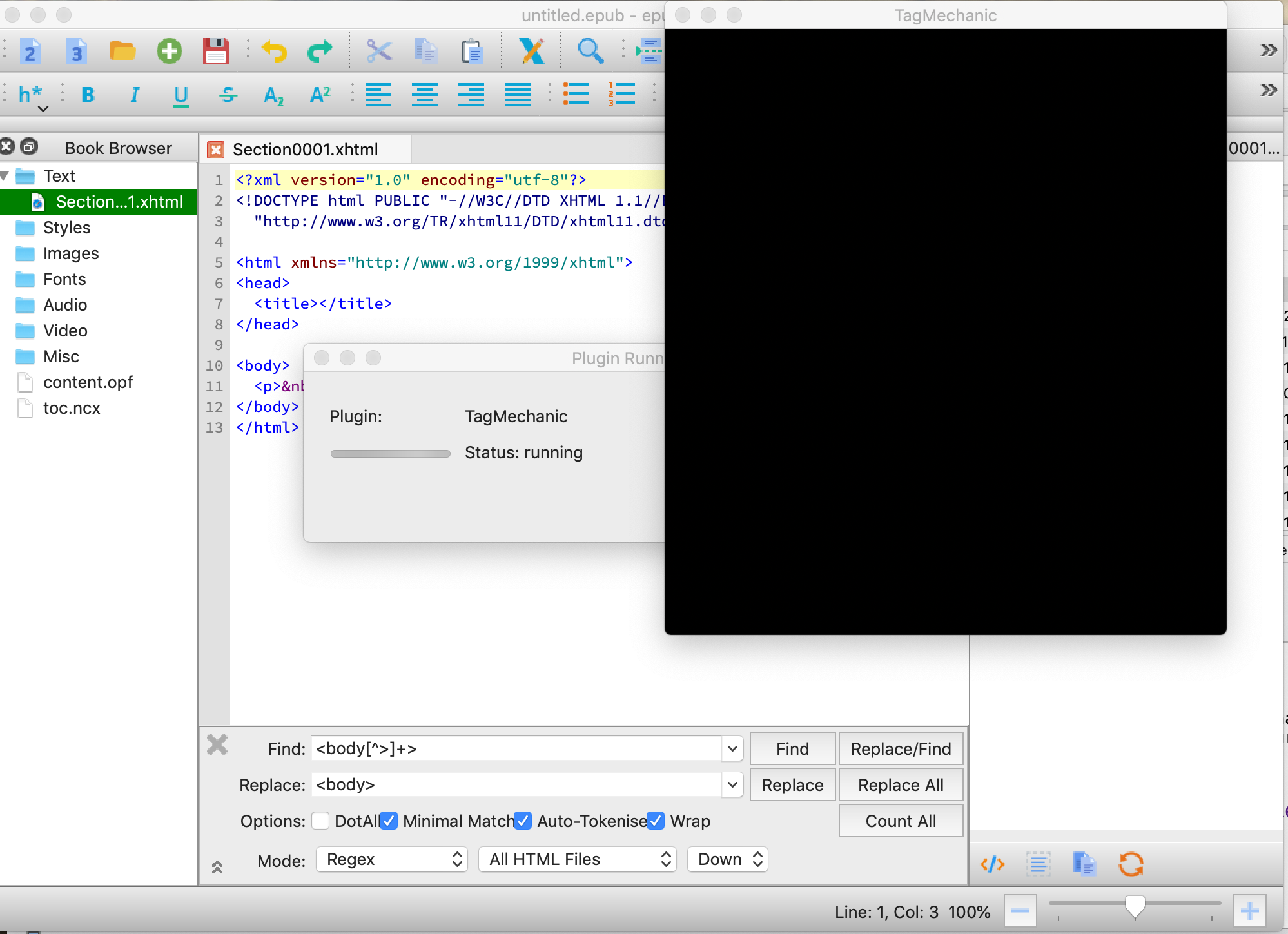 i'm using Sigil quite a long time without any problems, but with 1.1.0 on MacOs Mojave the pöugins only have a black screen I was searchng a little bit but i cant find this defect here or in the plugin subforum, so i guess its only me having this problem. i added a screenshot with Tagmechanix 0.4.4 but other plugins do show the same defect as well. What can i do to nail this down?