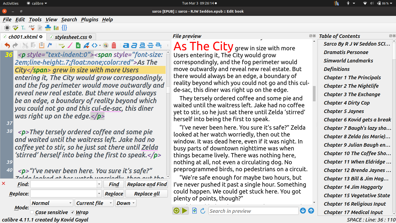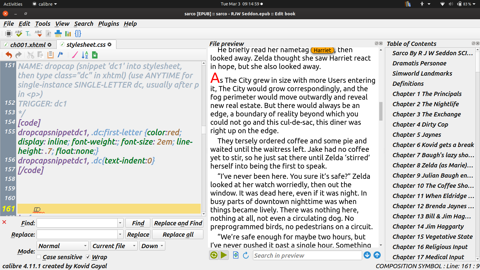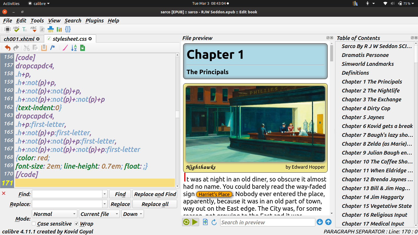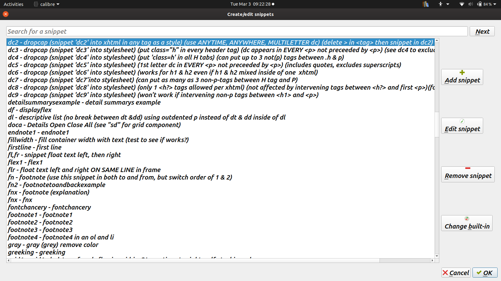 I have been interested for a long time in the best ways to visually enhance epubs by adding CSS code. I have 9 different ways of making DROPcaps and here is the first. I put in all nine of them in my snippet file and can call them up in the stylesheet.css with the trigger followed by ctrl-j to expand. This first one is one of my favorite. It requires you to put class="h" in every H tag first, but lets you mix in more than a single H tag within xhtml chunks. This one lets you follow any H tag with as many as 3 other things before the P tag. Add float:left to convert TALLcap to DROPcap.